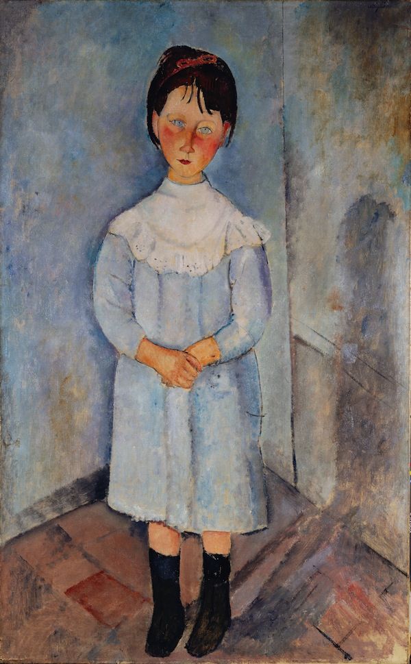 Modigliani incorpora gli occhi, tal insolito per lui è optar per questa scelta. La bimba è uno spettro, fissa il vuoto d’idee di chi la osserva. C’è l’ombra, distorta, sfumature del chiaro, il rosso del viso. Tanta cordialità in curve che però son livide, si snodano innaturalmente, disproporzione delle linee. Eppure, è quel che s’assimila a lui che era l’insolito. L’arte, quella primaria, nasce proprio dal folle dei detriti spesi in su d’una spora violenta. Consapevolezza d’essere venuti al mondo piangendo. I suoi lavori fatti in così poco, di getto, son fantasmi dell’implodere, s’alimentano di disordine, in sintesi dell’inadatto, come egli stesso era proprio inadeguato al mondo che lo costringeva a combatter demoni.